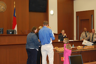 There were a lot of people there and we got to visit with many of the CAS families and staff. They had a photographer taking pictures of the families, flowers for the moms and dads to wear, games for the kids,and of course food. We also sang Happy Adoption Day and they had a huge cake. There were 59 adoptions being finalized today. Children of all ages and from all over the world, it was truly a joyous day. The families went into the courtroom in 2 groups, our group went second. Judge Bell who is also an adoptive mother called each family up one by one and presented them with their adoption certificate and Decree of Adoption, and each child also got a little teddy bear. If you can believe it when we were called I did not cry. I had already cried early in the day and also a few times on Friday. It was very emotional just thinking about it all. John Mac fell asleep just before we went into the courtroom and he slept through the whole thing. It was so funny because a lot of the CAS babies fell asleep at the same time and we were all walking up with sleeping babies in our arms.